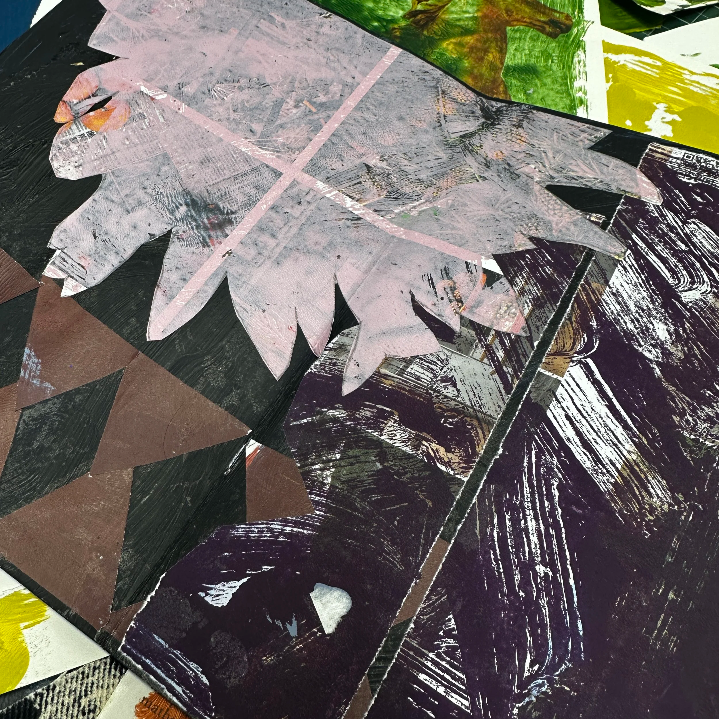 Working from her sunny home studio, she builds her paintings through textured layers of acrylics, oil pastels, and mixed media - where colour, pattern, and form gradually reveal themselves.